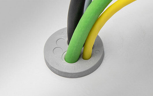 Die Bestückung mit elektrischen und pneumatischen Leitungen erfolgt in Sekundenschnelle. Dazu wird die entsprechende Membrane durchstochen und die Leitungen einfach durchgeschoben. Die KEL-DPR erm?glicht auch das Einziehen der Leitungen durch die Plattenrückseite. Durchstochene Membranen k?nnen mit Stopfen ST-B wieder verschlossen werden.
