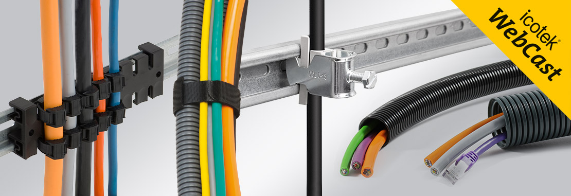 Mit den universellen icotek Systemen zur Kabelführung lassen sich Kabel, Leitungen und Schl?uche schnell, sicher und sauber verlegen und gleichzeitig gegen Zug entlasten. Und das sowohl bei statischer als auch bei dynamischer Beanspruchung. Die Einsatzm?glichkeiten reichen vom Verlegen von Leitungen an Maschinen, Schaltschr?nken und Geh?usen bis hin zu Energieführungsketten. Durch verschiedene Montagem?glichkeiten z. B. für die Hutschiene, C-Schiene oder zur Direktmontage bieten sich vielf?ltige Einsatzm?glichkeiten. Die Montage der Leitungen erfolgt durch handelsübliche Kabelbinder. Hinterschneidungen am kammartigen Profil verhindern ein Herausrutschen der Kabelbinder und erm?glichen einen sicheren Halt. Au?erdem stellen wir Ihnen die CONFiX? Schlauchdurchführungen vor, mit welchen sich in Schutzschl?uchen geführte Leitungen sicher und einfach in Maschinen, Steuerpulte oder Schaltschr?nke einführen lassen.