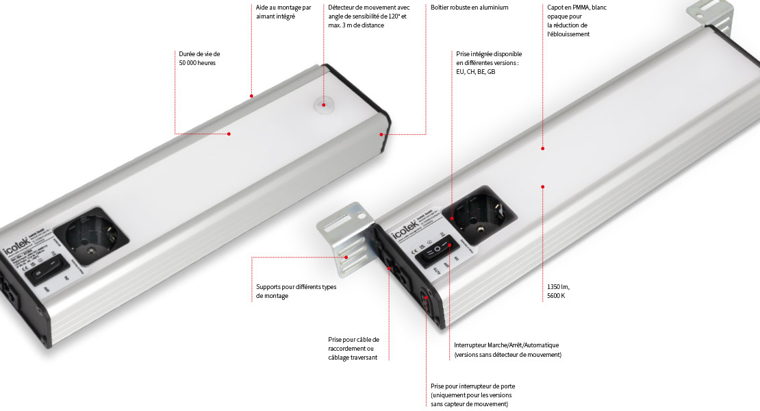 Le luminaire ALU-LINE offre également une prise intégrée disponible dans les versions EU, CH, BE ou GB.