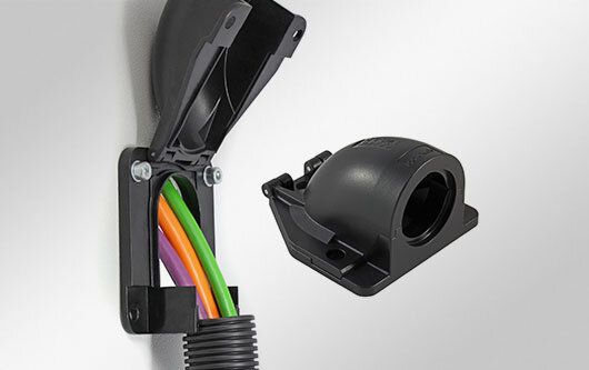 Pour l’utilisation aisée, le système de passage de gaine est complété avec les gaines flexibles séparables CONFiX? WST pour l'introduction de cables pré confectionnés, et lessupports de gaine approprié, le CONFiX? SH.