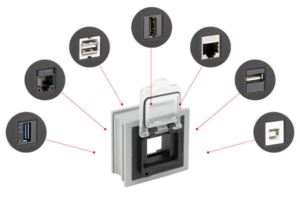 適配穿芯AT-KS也是基于大型KT穿芯設(shè)計(jì),適配穿芯QT-AT-KS也是基于大型QT穿芯設(shè)計(jì)。開(kāi)孔可實(shí)現(xiàn)基于Keystone系統(tǒng)的所有耦合器嵌入式組裝(USB, RJ45, HDMI和約70個(gè)Keystone適配器)。