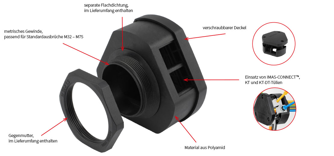 Leitungen von 1 bis 15 mm Durchmesser k?nnen eingeführt, mit IP54 abgedichtet (zertifiziert nach EN 60529) und zugleich gem?ss EN 62444 zugentlastet werden. Das Verteilergeh?use passt auf metrische Standardausbrüche und wird mit einer Gegenmutter befestigt, die im Lieferumfang enthalten ist. Durch den verschraubbaren Deckel und die Verwendung von geteilten Kabeltüllen sind anschliessendes Nachrüsten oder Servicearbeiten problemlos m?glich.